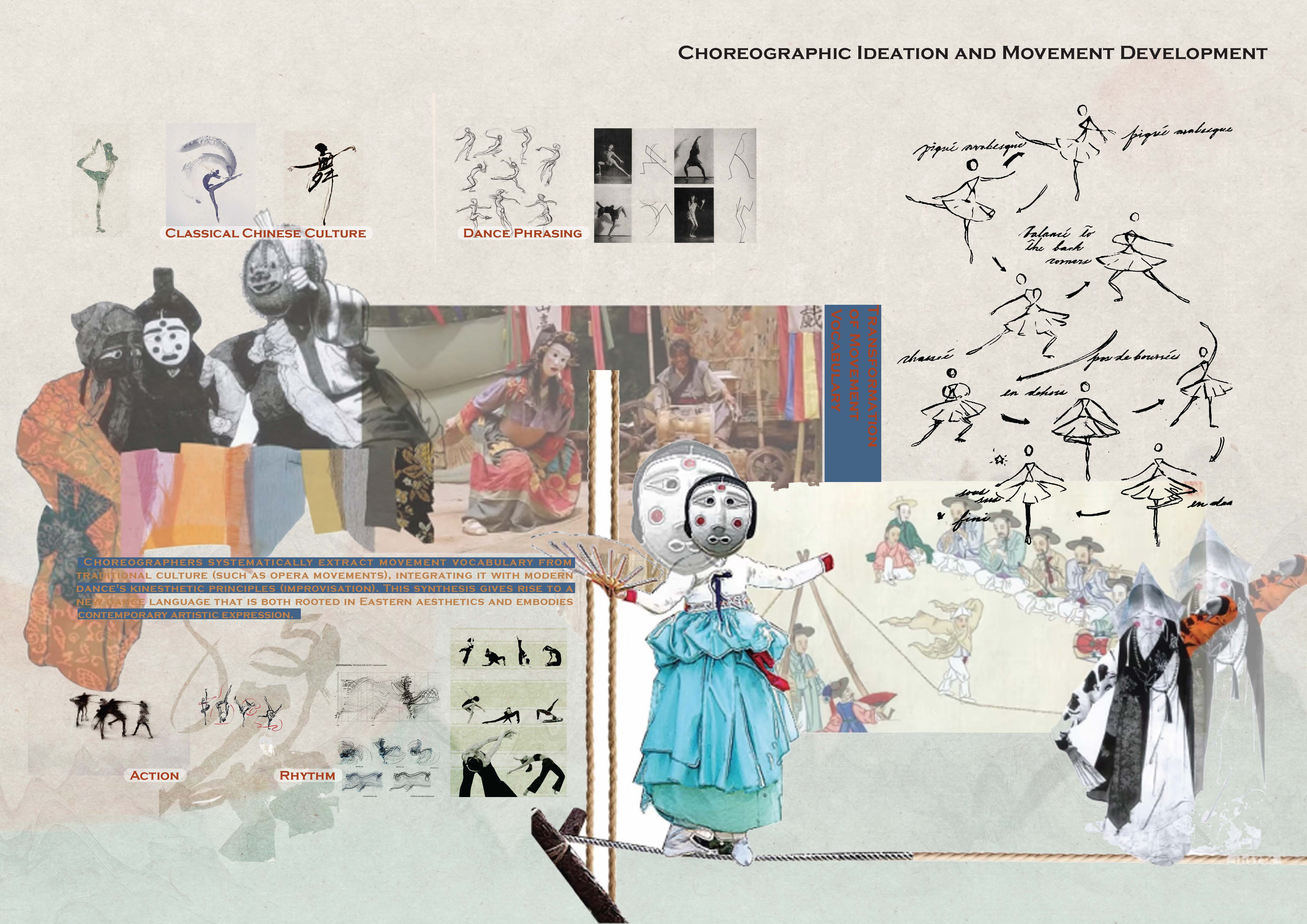 To promote cultural expression through dance, we formed a performance group that brings together dancers who share the same desire to tell untold stories. We co-created original and adapted works that fuse traditional Chinese movement vocabularies (e.g., opera gestures) with contemporary choreographic methods, resulting in a new kinetic language. Our group organized public outreach performances, especially in elder care communities, offering emotional resonance and cultural familiarity. Through visual choreography notes and movement mapping, we documented our process as both a cultural and theoretical inquiry—bridging heritage with innovation in tangible, community-driven ways.
